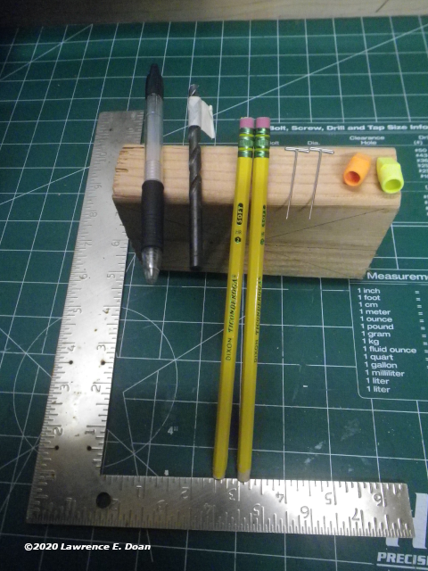 What we're going to do is take a block of wood and drill two holes in it about 1 1/2 inches apart. We'll take the two pencils and stick them in the holes to make two uprights. We'll put the erasers or the T-pins in the ends of the pencils to make a nice pivot for our airplane to balance on.